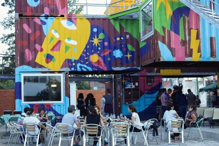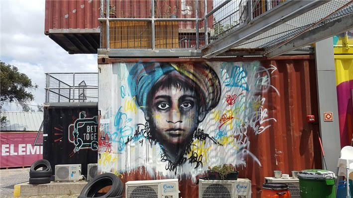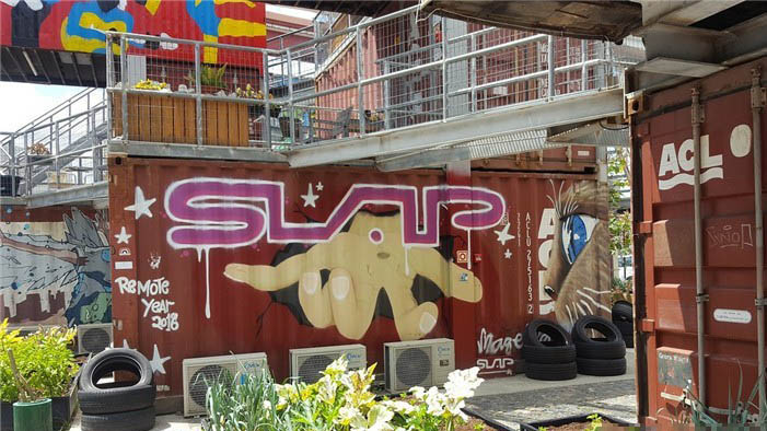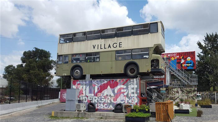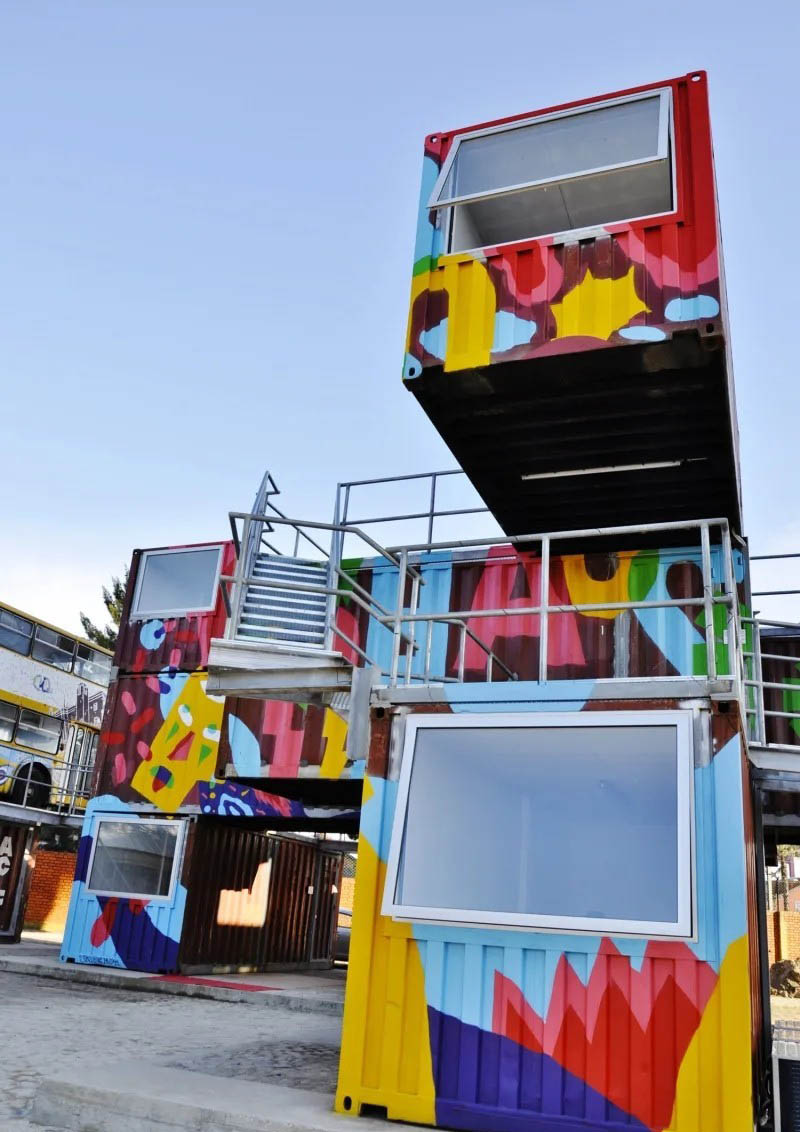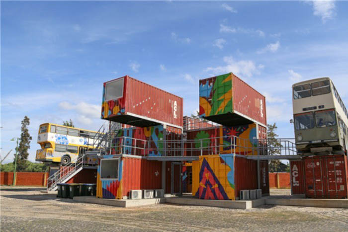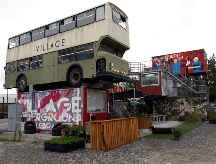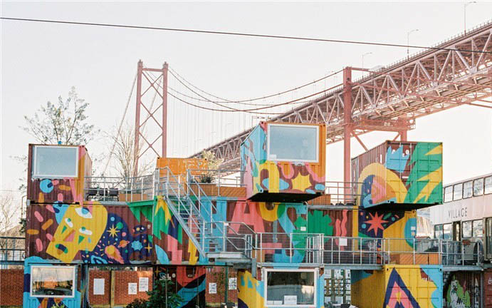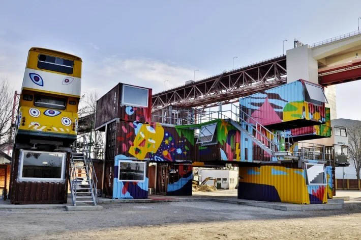 里斯本地下村由14个海运集装箱和2辆残疾人巴士组成,建筑外墙的设计色彩格外缤纷,仿佛在用颜色宣扬着这里自由的理念,也让这里能成为方圆十里最亮眼的存在。每一个箱面都能成为创作的画布,街头式的艺术涂鸦在这里随处可见。