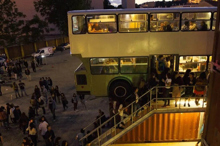 看到这里,如果你以为这是一座娱乐建筑,那你就错了。这里真正的英文名为【Village Underground Lisboa】,是创意活动的合作空间,也是文化活动的场所。对于那些想在这类网络空间工作的人来说,有60个可用的地点,这是集创意、文化和炫酷为一体的空间。