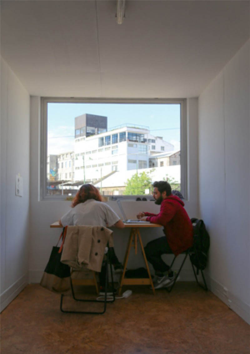 进入室内,这里的每个集装箱可以由五个人共享,价格在每人每月150至200欧元之间,现场硬件配套包括无线互联网、电力供给和空调等,桌椅则需要由入驻的创业者自己带上。