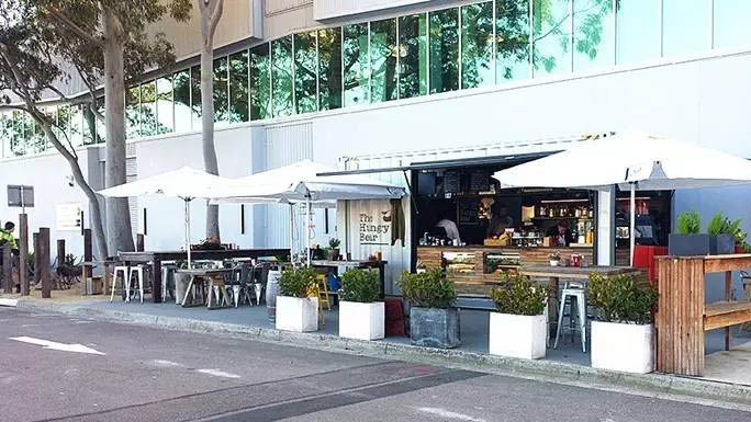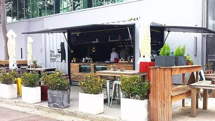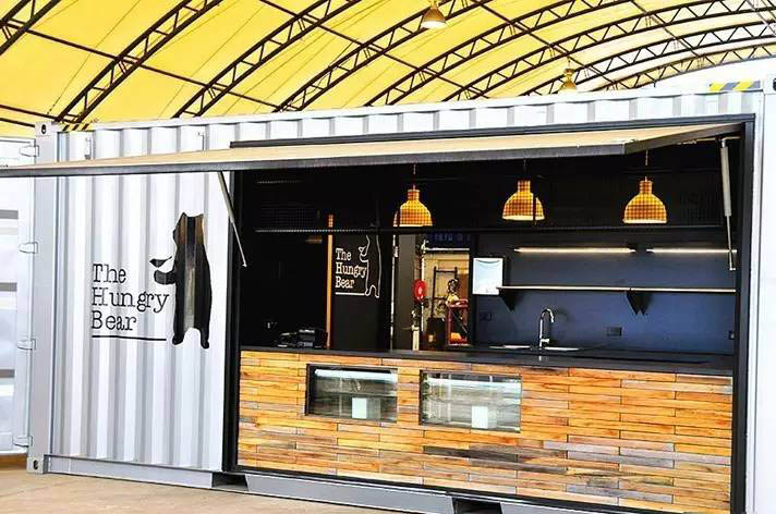 POP-UP集装箱的制造相对传统的建筑的制造要更加方便,The Hungry Bear Café是由一个20尺的可持续利用的海运集装箱改造而成,采用了可循环使用的硬木作为咖啡厅的门面和墙体,侧面和正面利用了集装箱的特性,头板和侧板向上打开延伸为遮阳板,也可预防下雨天气。