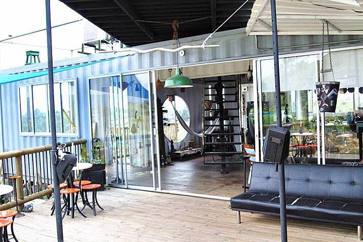 房屋巧妙地利用了集装箱的灵活性,交错重叠,合理安排室内外空间,设置了露天阳台,房屋侧面也安上玻璃门窗,山上美景一览无遗。