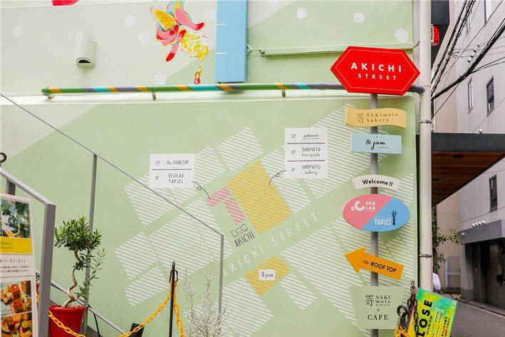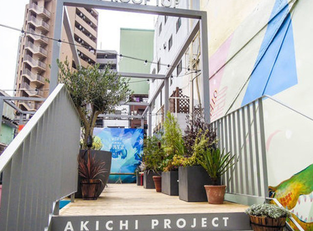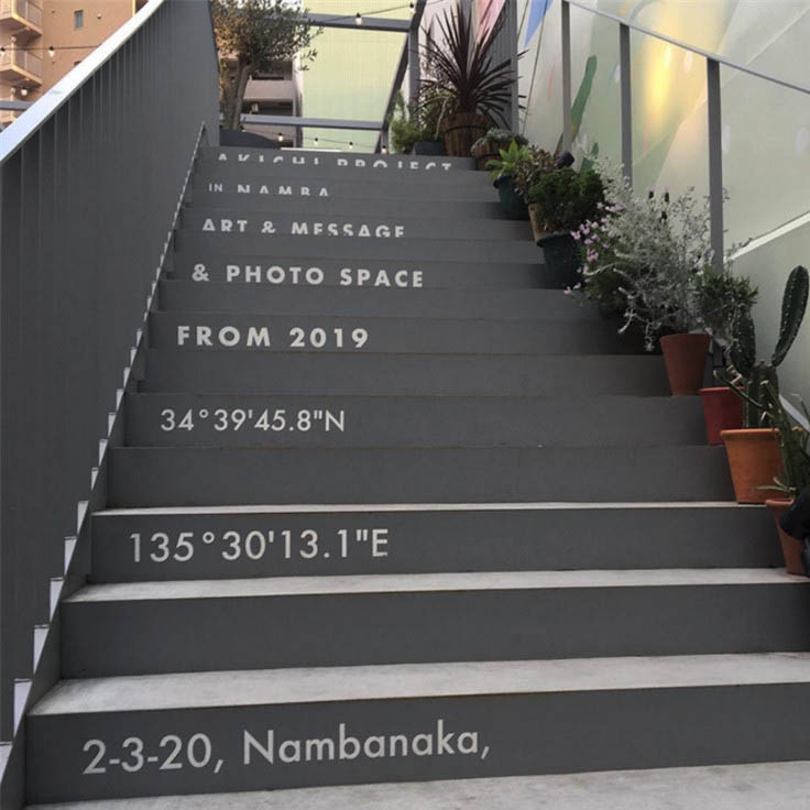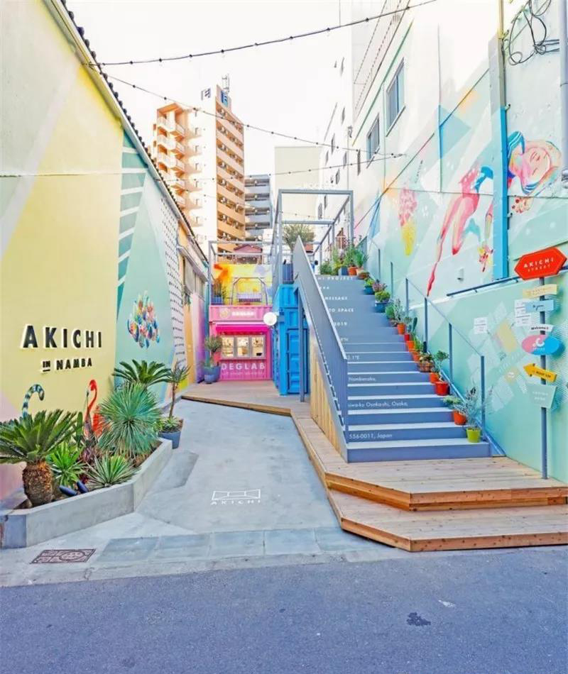 【Akichi in NAMBA】是这里的名字,商家充分利用了集装箱的平顶优势,在集装箱的上方搭建了一个小露台,刚好形成一个L型的“阶梯+露台”布局。其中一个蓝色集装箱就是阶梯底下“默默付出的箱子”。