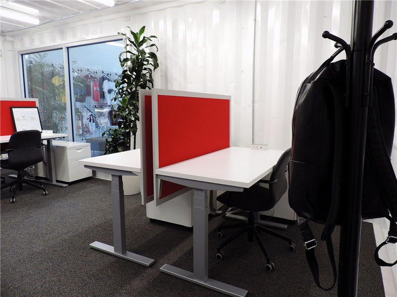 现场共有两个集装箱建筑组成一个办公空间,中间是一个白色的咨询前台。