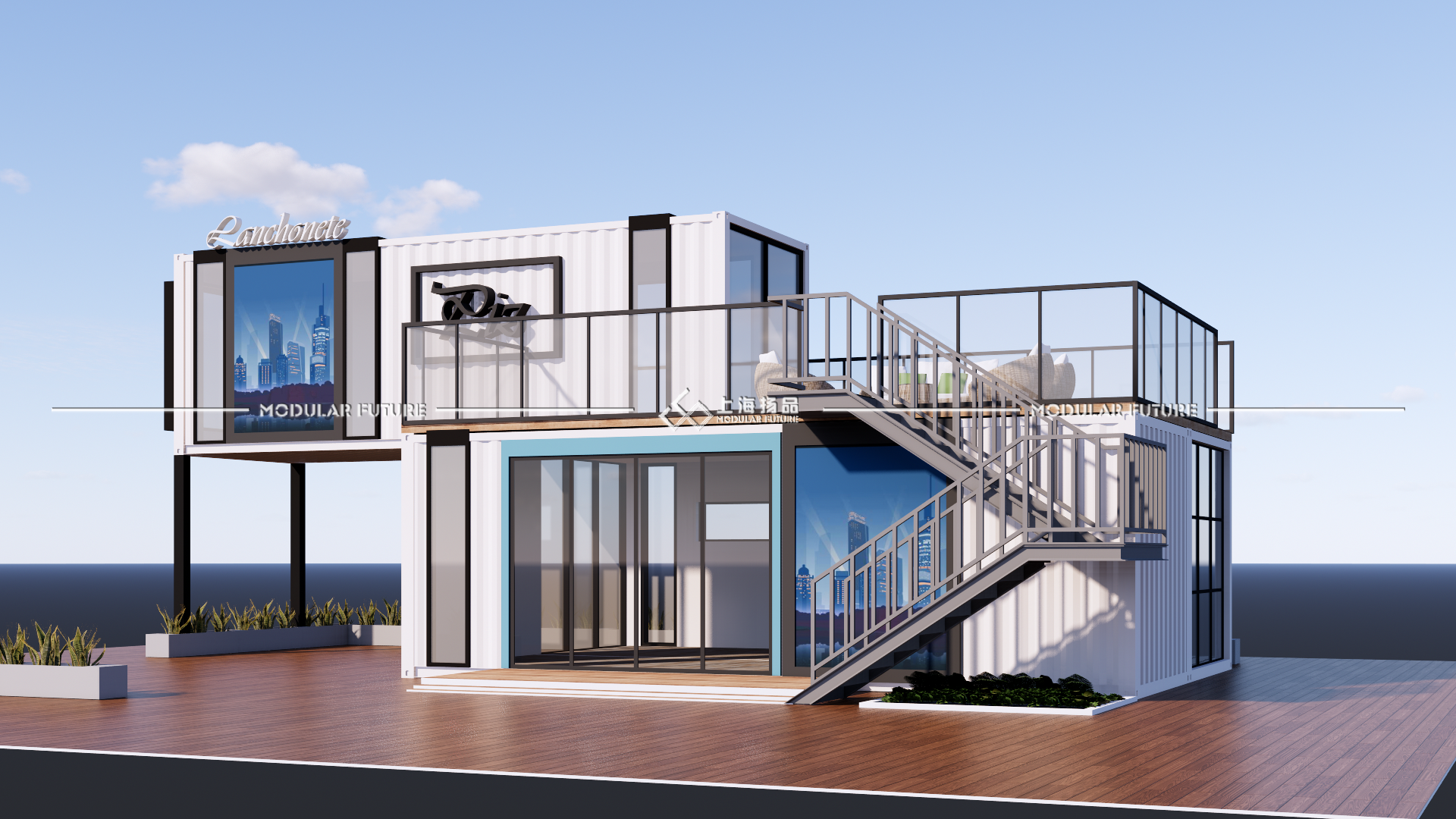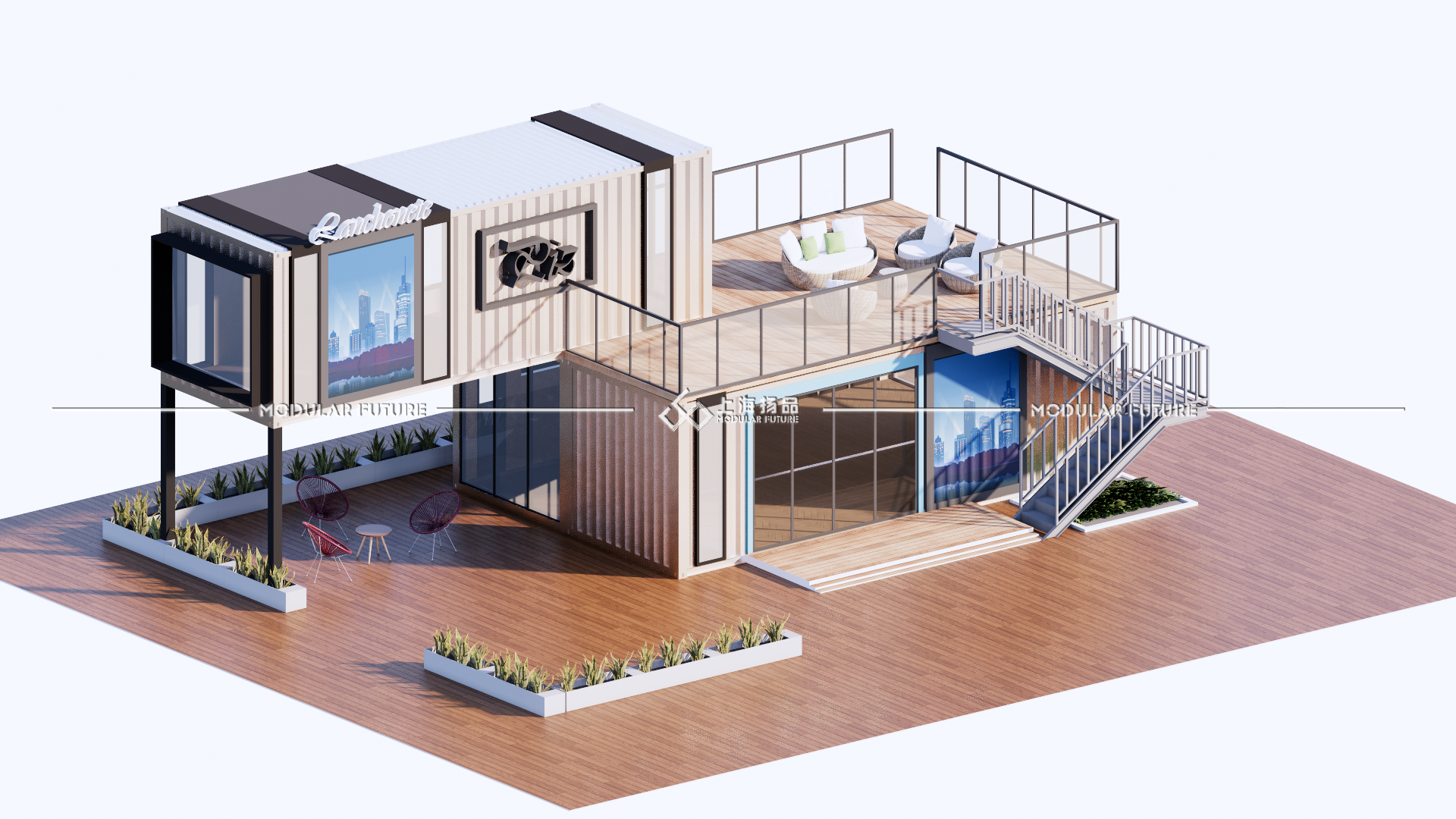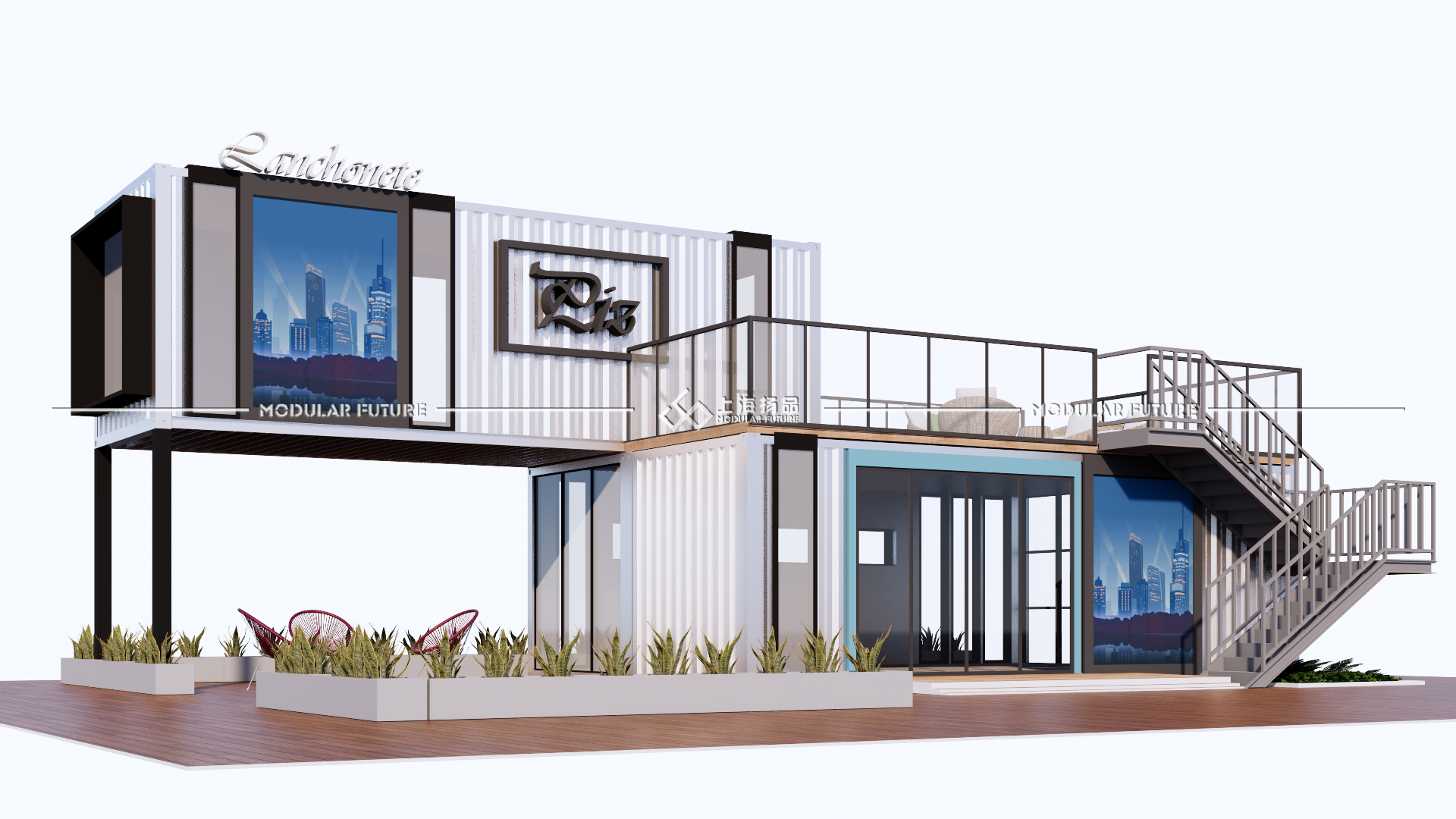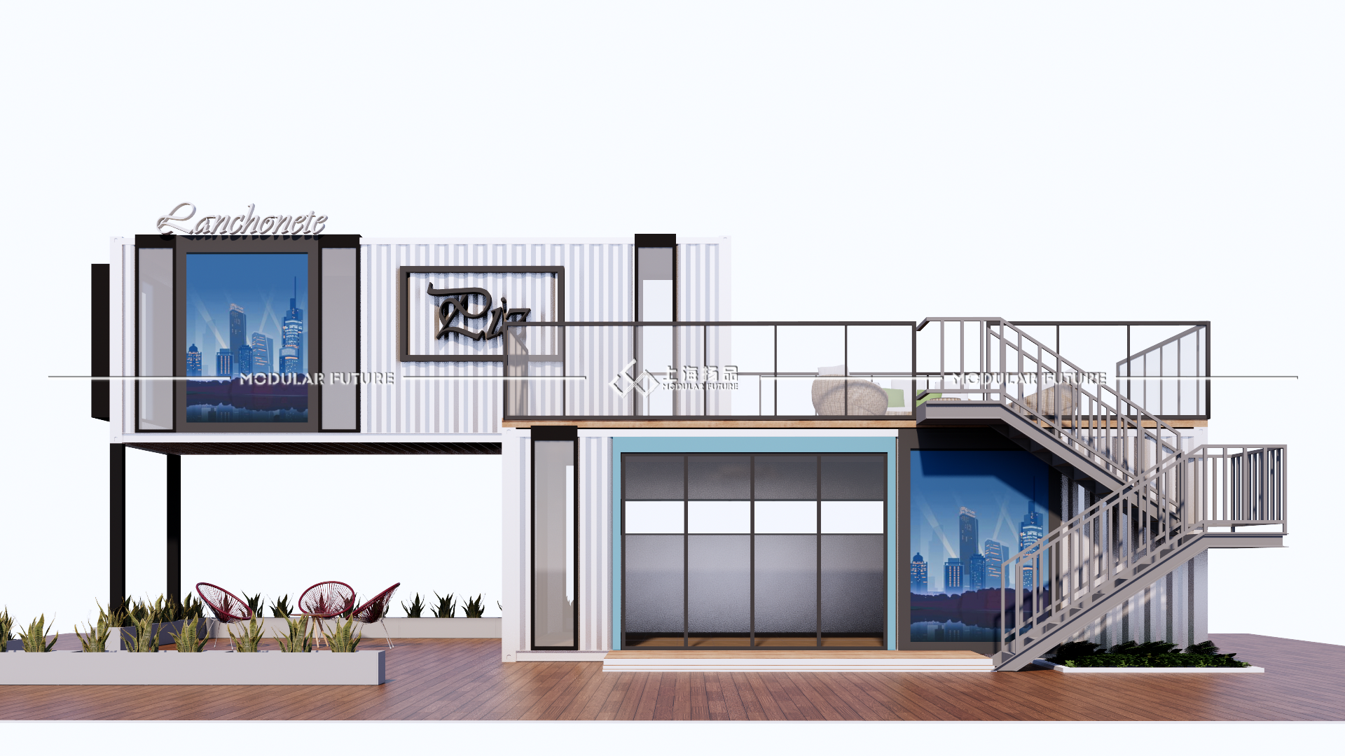 此次设计采用三个六米的集装箱,拼接出54个室内使用平方。利用集装箱的优质承重力打造出开放式露台增加户外面积。整体采用黑白灰色系营造商务气息,点缀蓝色线条门框提亮视觉美观度。